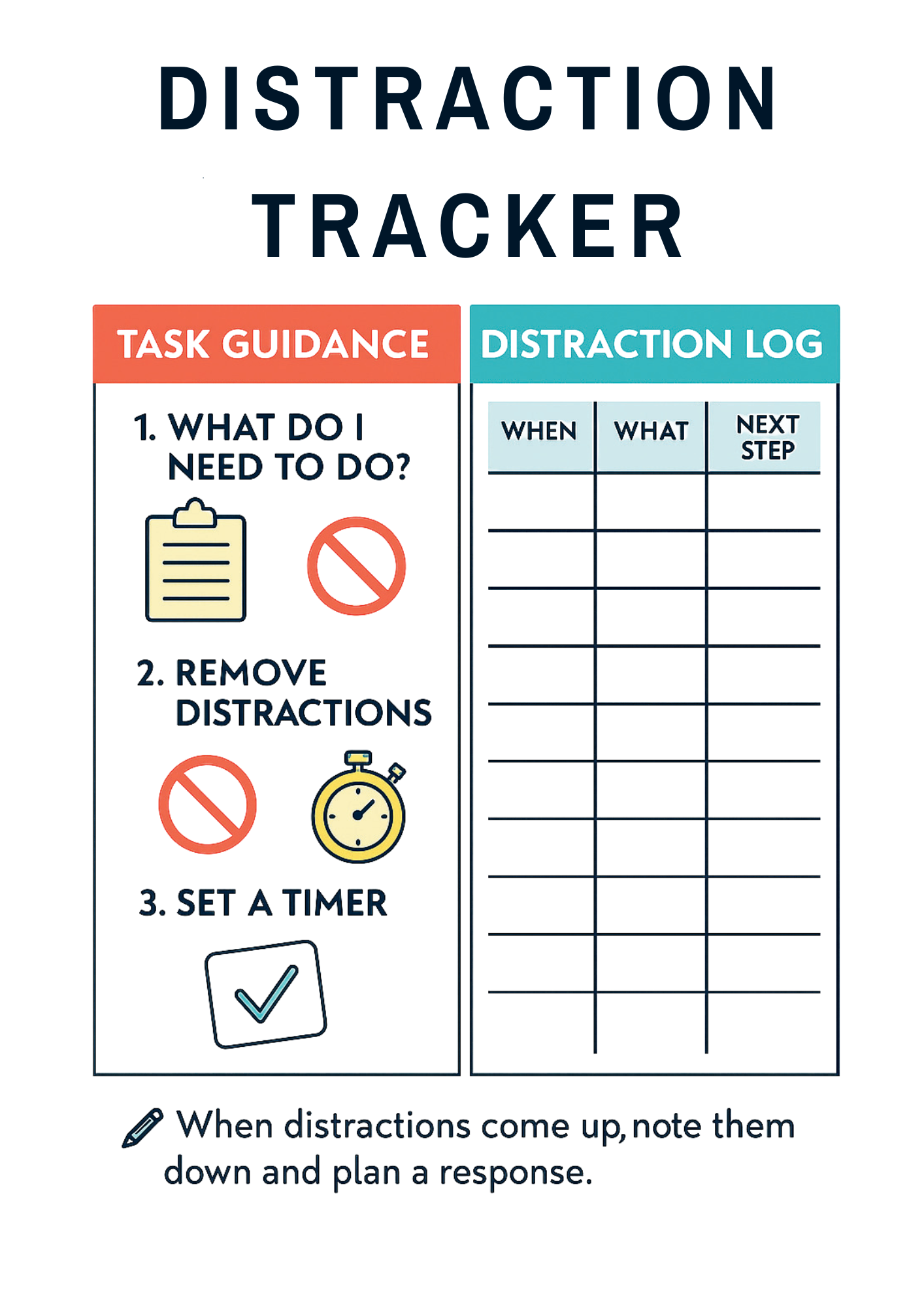 Use before starting a task — even a small one. Fill the prompts in quick, messy handwriting. Keep the sheet visible. When you lose focus, jot it down instead of forcing attention. Use again when switching tasks.