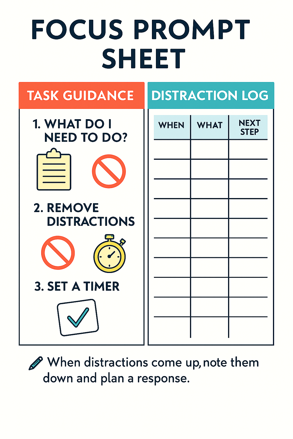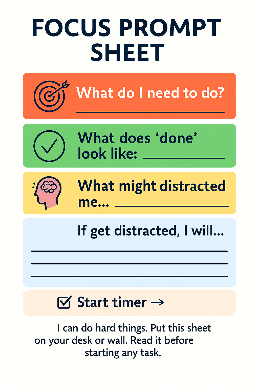 Use before starting a task — even a small one. Fill the prompts in quick, messy handwriting. Keep the sheet visible. When you lose focus, jot it down instead of forcing attention. Use again when switching tasks.
